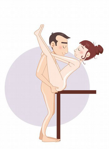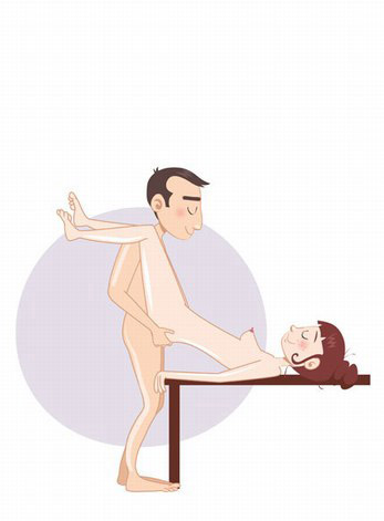 这个姿势需要一定的技巧能力!女人坐在桌边。男人则站在她的面前,他的双腿弯曲,搭在他的肩膀。他能最好的"进入"姿势。 她搂着他的脖子以支撑自己的平衡。女人身体后倾,男人抱住她的屁股来回推送抽插即可!