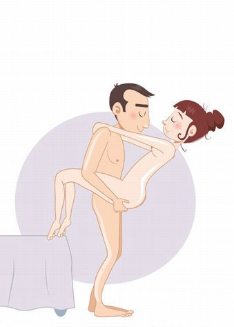 女生可以坐在家里的家具上面,比如桌子,洗衣机,橱柜等等平面的东西之上,而男人只要站在她的前面即可,女人用双腿弯曲锁住男人的臀部身体,以便让男人的阴茎可以更深入的达到子宫。男人可以控制好站立的角度,用力的挺进即可享受天伦之乐。