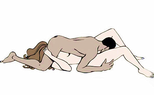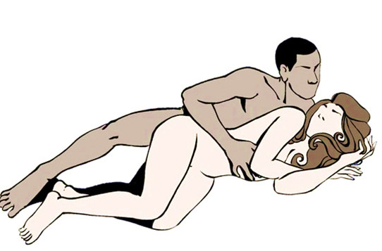 有益于怀孕。前戏之后轻轻插入。后侧体位法是男女双方皆侧卧,而女性由背后接受阴茎的插入。方法是男性要从女性背后紧抱着对方,如果右侧在下,左手还能自由活动,所以可以温柔爱抚女性的脖子、腹部等。因为这种体位法,使女性无法积极参与,但能够充分接受男方的爱抚增加快感。在前戏之后,将阴茎插入阴道内,要慢慢地插,为的是要稍转身,上半身就会离开女方。男性的位置可以决定结合深度和性运动的程度,如果仍嫌不足,男性可以利用右臀提起上半身,用左手抱着女性大腿的姿势,可以使得结合得更深入、更满足。这种体位法的优点,是女性的负担减轻很多,对下腹部及子宫的压迫感没有了,对于正怀孕中,疲劳或者是生理期中女性状况不佳的时候,一种很适当的体位法。